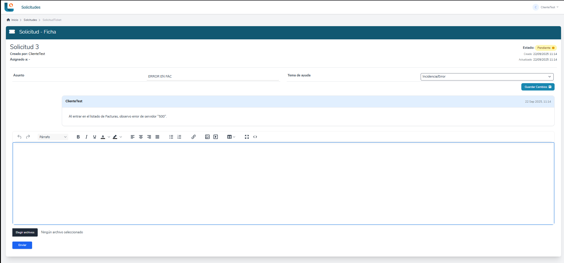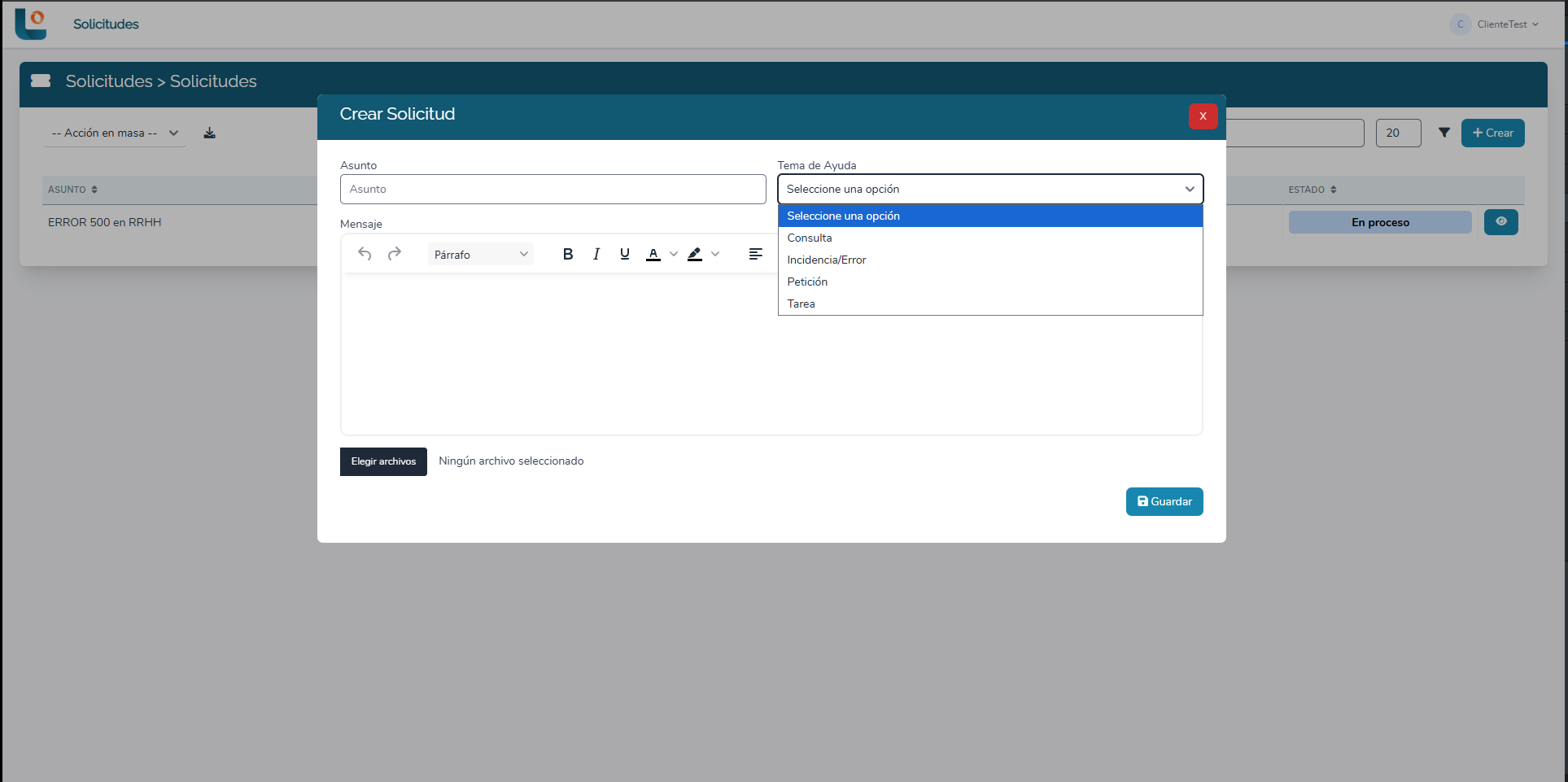 Al clicar, se abre el formulario para crear el ticket. Ponemos asunto, tema de ayuda, contenido y una imagen si se desea. Al guardar, se abrá registrado el ticket y un agente le dará respuesta a la mayor brevedad posible.