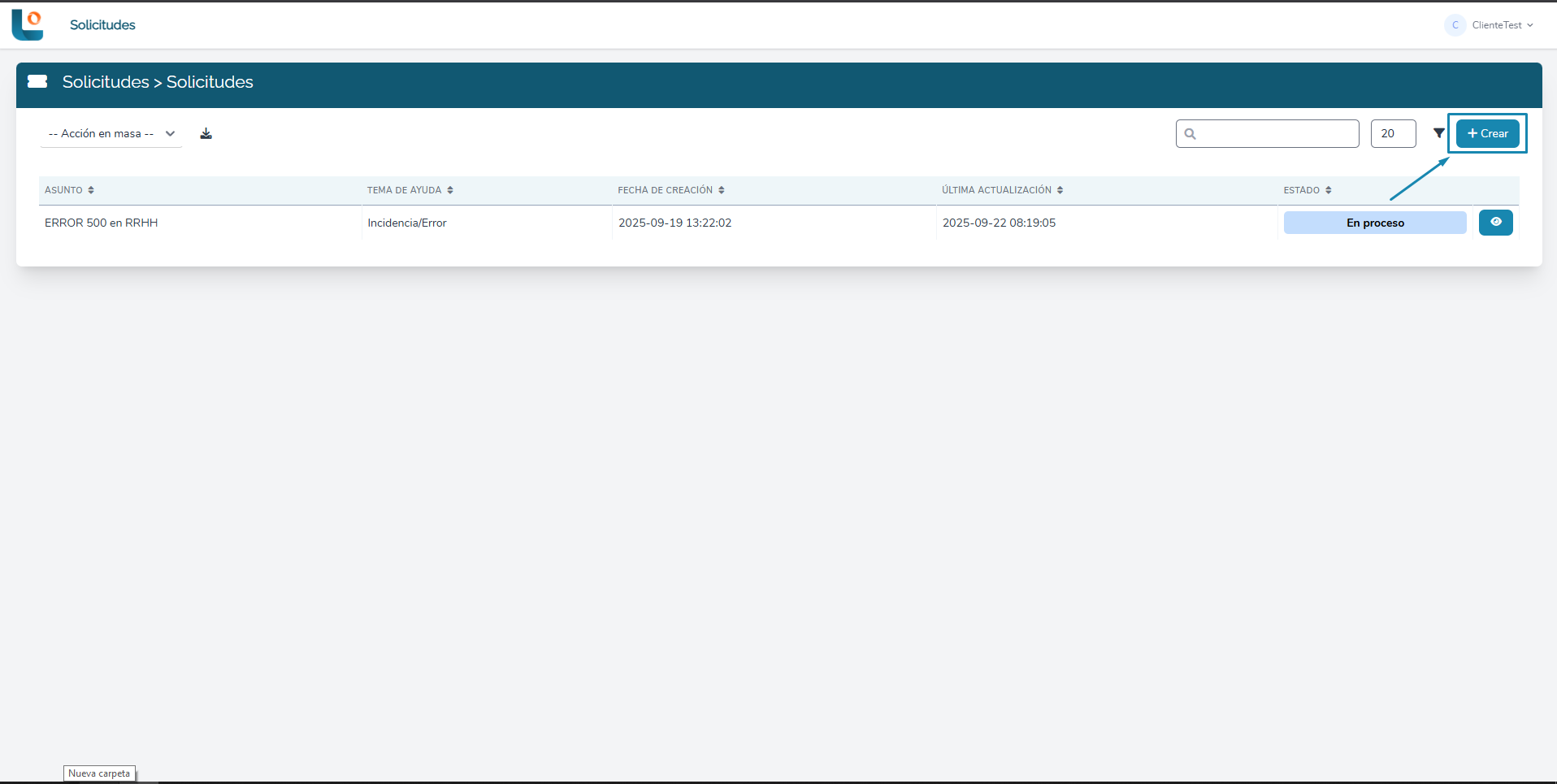 Al iniciar sesión, podemos visualizar nuestros tickets creados junto a su estado y más información. Para crear un nuevo ticket, clicamos en el botón de la tabla Crear.